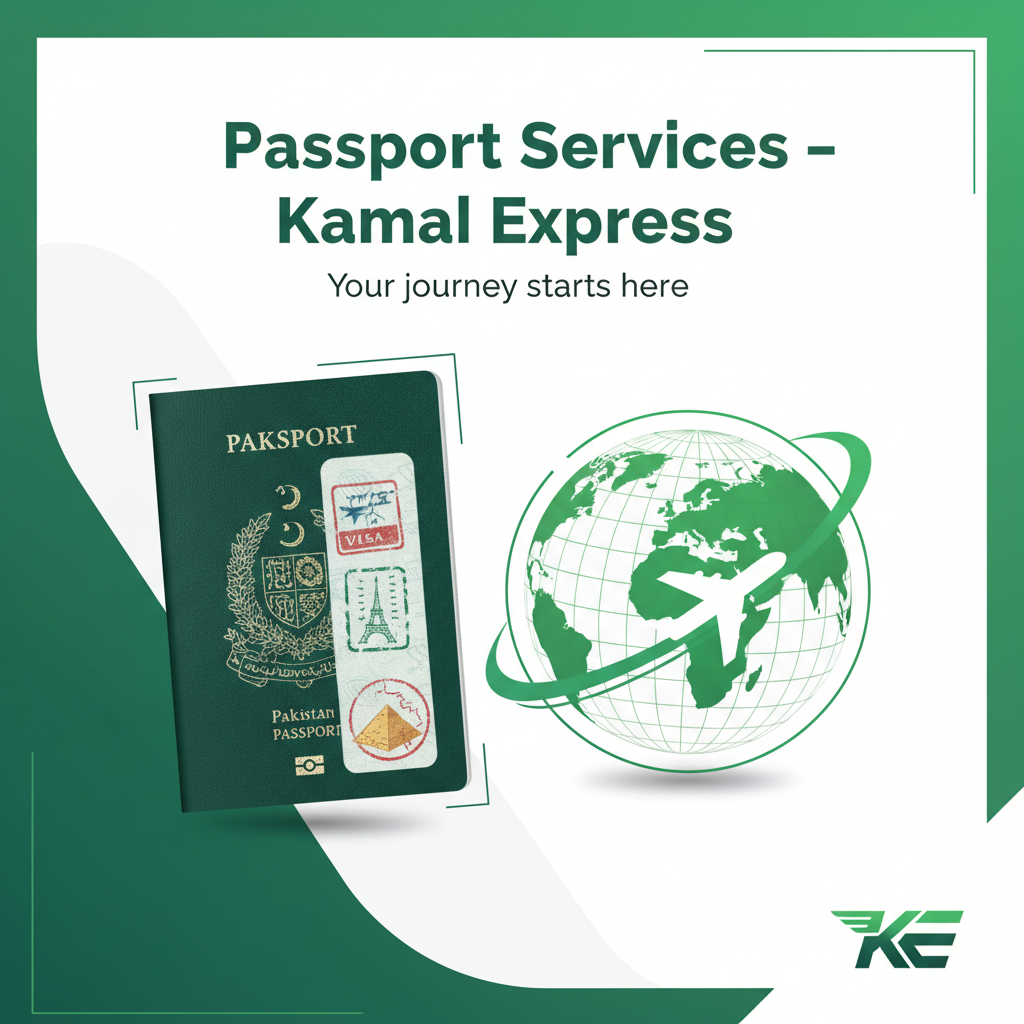 A professional clean banner design for a travel and documentation company named Kamal Express, focusing on Passport Services. Include a Pakistani passport, globe, airplane, and travel stamps. Use green and white colors to reflect trust and Pakistan identity. Bold title text: Passport Services – Kamal Express. Style: modern, sleek, high-resolution, corporate travel theme.